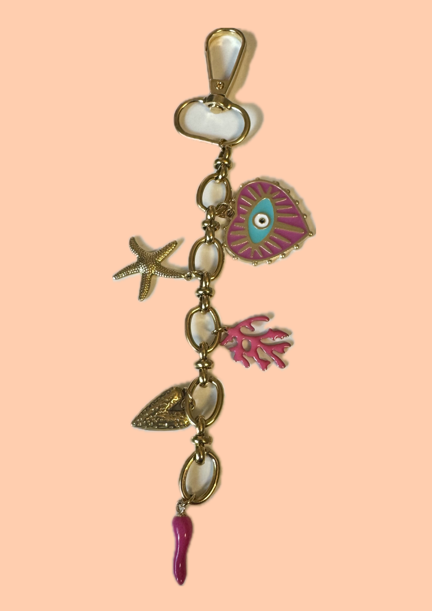 Grigri de sac fuschia comprenant 5 charms : l'oeil karma fuchsia, le corail fuchsia, l'étoile de mer, le petit coeur martelé et le piment fuchsia.